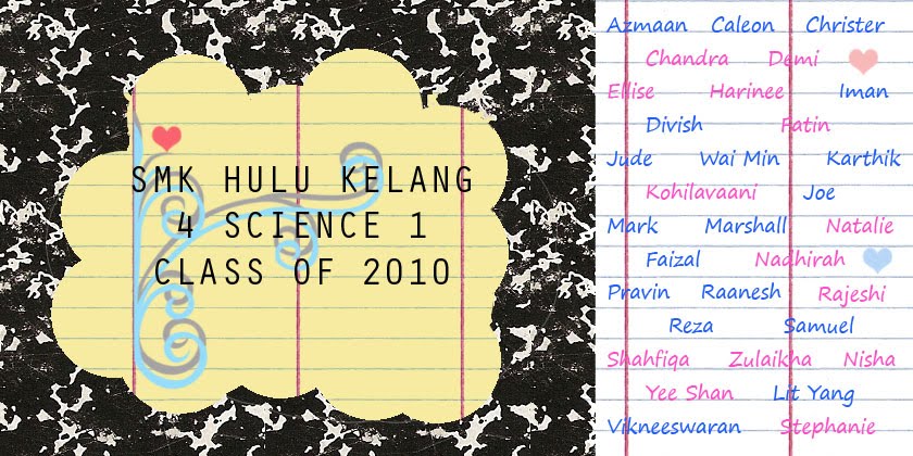 Welcome to 4 Science 1, batch 2010. Our class is located in Block C, toppest floor. We've been 'living' in there since Form 2, up til now. :)